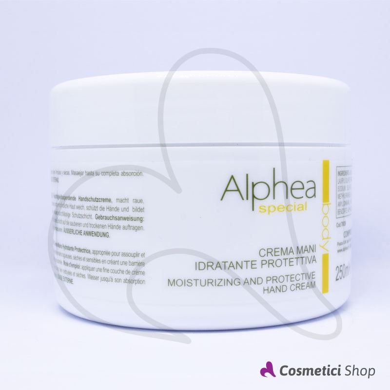 La crema mani protettiva Alphea è formulata per svolgere una profonda azione idratante ed emolliente su mani ruvide, secche e sensibili, creando una barriera idrorepellente cutanea. Grazie alla sua texture soffice e delicata, si applica con facilità e si assorbe rapidamente. La formula arricchita con glicerina cura e previene irritazioni, arrossamenti e screpolature, creando inoltre un film protettivo invisibile che le avvolge, isola e preserva il benessere delle mani dalle aggressioni esterne sia di tipo chimico che meccanico.