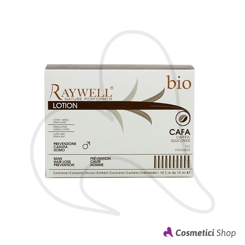 Il trattamento in fiale prevenzione caduta uomo Cafa della linea Bio di Raywell stimola la crescita dei capelli, aiuta il rinnovamento cellulare ed apporta nutrimento al bulbo pilifero, grazie alla formula con caffè verde, olio di Camelia e Bio-Prolina.