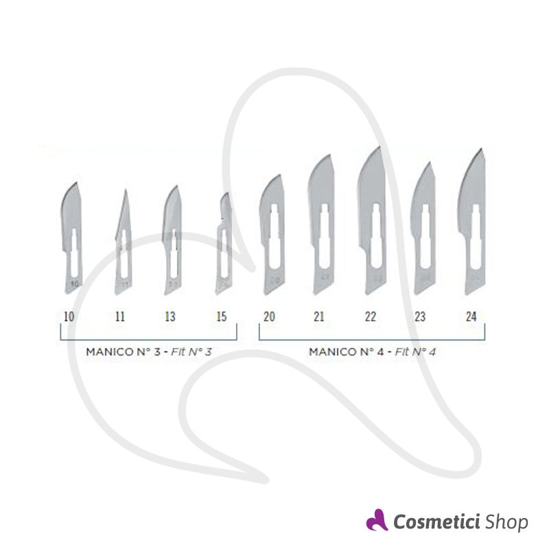 Lama in acciaio chirurgico sterile, monouso, ad uso dermatologico, da inserire sul manico del bisturi.