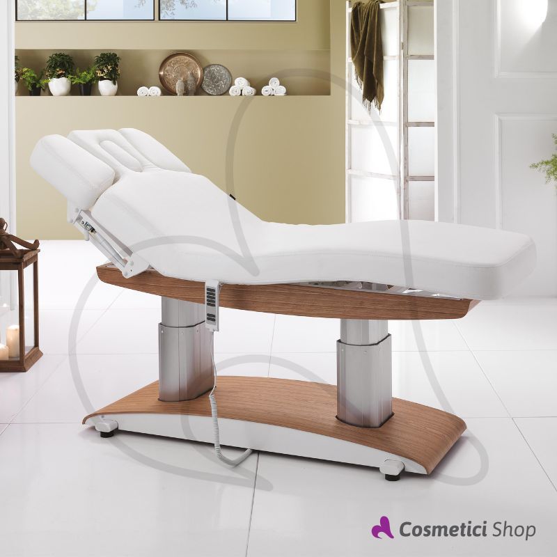 Ocean Wood SPA di Xanitalia è un lettino elettrico realizzato con struttura in acciaio con finiture in legno, rivestimento in tessuto sky ecopelle bianco resistente all'acqua e facilmente lavabile, e base con luci Led. Progettato con 4 motori che gestiscono la regolazione elettrica dell'altezza, dello schienale e del poggia gambe. Dotato di cuscino e foro poggiaviso, e materasso spessorato estremamente confortevole.
