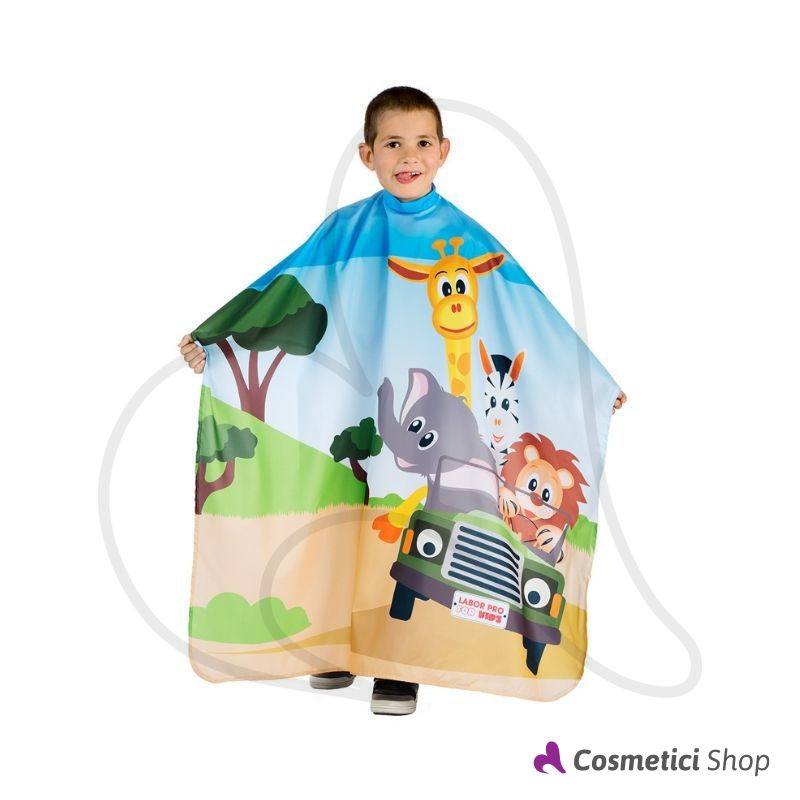 Mantella per taglio capelli bambino in materiale 100% poliestere facilmente lavabile, con stampa fantasia Safari, rifinita ad orlo e con chiusura al collo con automatici. Taglia unica. Dimensioni 130x100 cm.