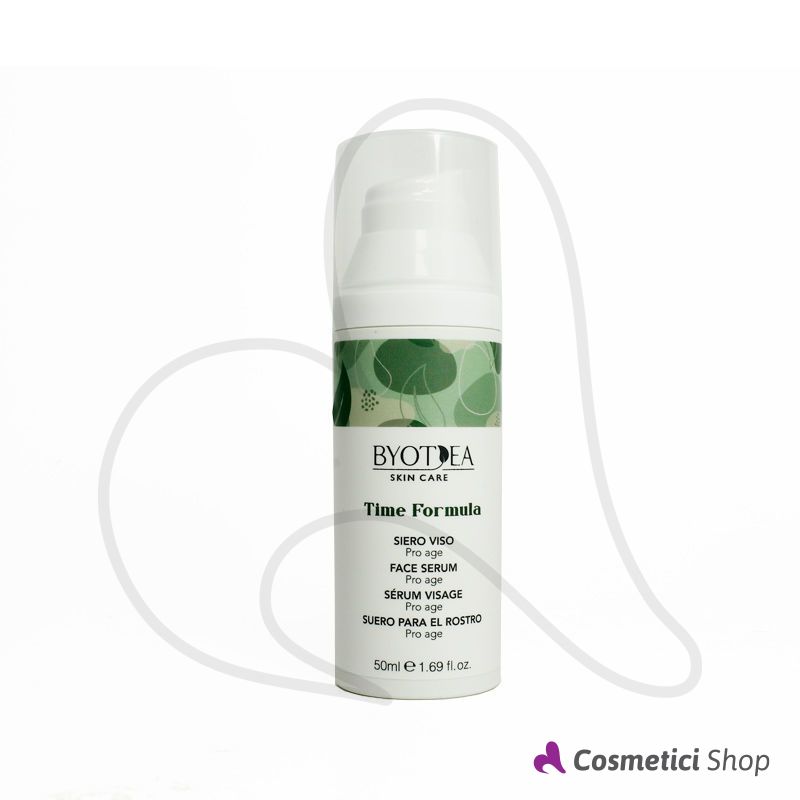 Il siero viso pro-age Time Formula Byotea è adatto alla pelle giovane o con le prime rughe, contribuisce a proteggere la barriera idrolipidica della pelle migliorandone i livelli di idratazione e rendendola più sana e più liscia. La sua speciale formulazione aiuta a prevenire la comparsa dei primi segni di invecchiamento cutaneo, grazie allo Spillantolo (estratto naturale di Acmella), che protegge e rassoda la pelle ancora giovane ma stressata da fattori endogeni, esogeni ed ambientali, e all'Acido Ialuronico ad alto e basso peso molecolare, che svolge un'azione filmogena con effetto tensore e protettivo, ed ha proprietà rimpolpante, riempitiva e idratante.