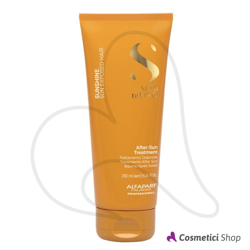 Sunshine After-Sun Treatment della linea Semi di Lino di Alfaparf Milano è un trattamento restitutivo per capelli stressati da sole, cloro e slisedine. Nutre e districa contrastando i danni provocati dall'esposizione prolungata a sole, cloro e salsedine, senza appesantire, per capelli morbidi e lucenti. La formula Vegan contiene: Shine Fix Complex dal potere illuminante, Color Fix Complex con filtro UV e antiossidante per prolungare la bellezza del colore, Climate-Proof che crea una barriera protettiva e mantiene il capello idratato al variare di umidità e temperatura, Sun Shield che protegge la fibra del capello contro i danni ossidativi da radiazione solare e favorisce il benessere della cute, e Chlorine Fence, un attivo che contrasta il deposito di cloro e migliora le proprietà sensoriali del capello.