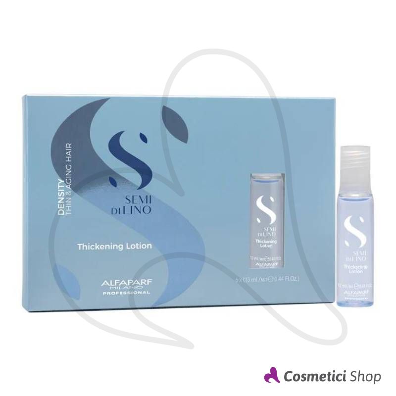 Thickening Lotion della linea Density Semi di Lino di Alfaparf Milano è un trattamento in fiale senza risciacquo ispessente per capelli assottigliati e maturi. Grazie ai suoi principi attivi agisce internamente ed esternamente alla fibra capillare proteggendola e rinvigorendola. La formula, Vegan e biodegradabile, contiene: Urban Defence Pro ad azione anti-inquinamento e protezione totale, Shine Fix Complex con potere illuminante dalle radici fino alle punte, Color Fix Complex con filtro UV e antiossidante per preservare il colore cosmetico e prolungarne la bellezza, Climate-Proof che crea una barriera protettiva che mantiene il capello idratato al variare di umidità e temperatura, e Filler Complex che rimpolpa e dona spessore ai capelli assottigliati che hanno perso il loro naturale corpo. Non appesantisce e rilascia una gradevole fragranza cipriata e fruttata. I capelli appaiono più corposi, spessi e rivitalizzati.